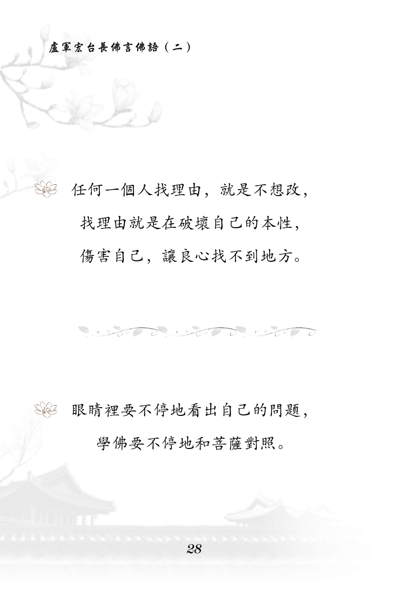 不限会员 任何一个人找理由,就是不想改, 理由就是在破坏自己的本性, 伤害自己,让良心找不到地方。 眼睛里要不停地看出自己的问题, 学佛要不停地和菩萨对照。 |佛言佛语第二册