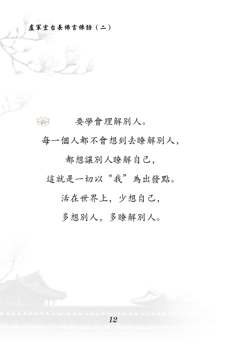 不限会员 要学会理解别人。 每一个人都不会想到去了解别人, 都想让别人了解自己, 这就是一切以我”为出发点。 活在世界上,少想自己, 多想别人,多了解别人。 |佛言佛语第二册