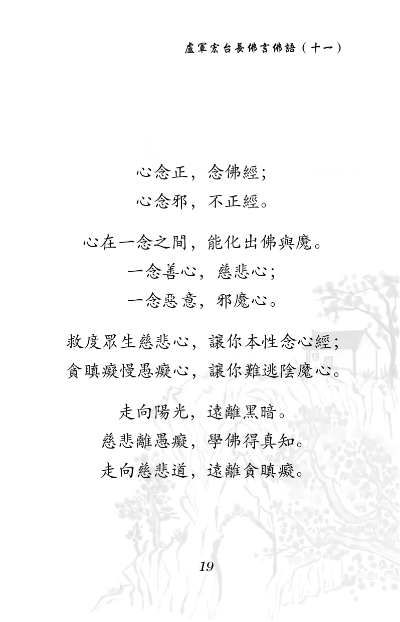 不限会员 去除烦恼,你就会拥有菩提; 拥有菩提的智慧, 就能克服人间的五浊, 从而达到远离恶世, 拥有菩提般的般若智慧。 坚强的信念, 来自于一颗慈悲的心; 顽强的意志, 来自于一种平等的心。 心无罣碍,净中生莲; 心灵净土,长住人间。 法无空法法生性; 似空非空证菩提。 |佛言佛语(十)