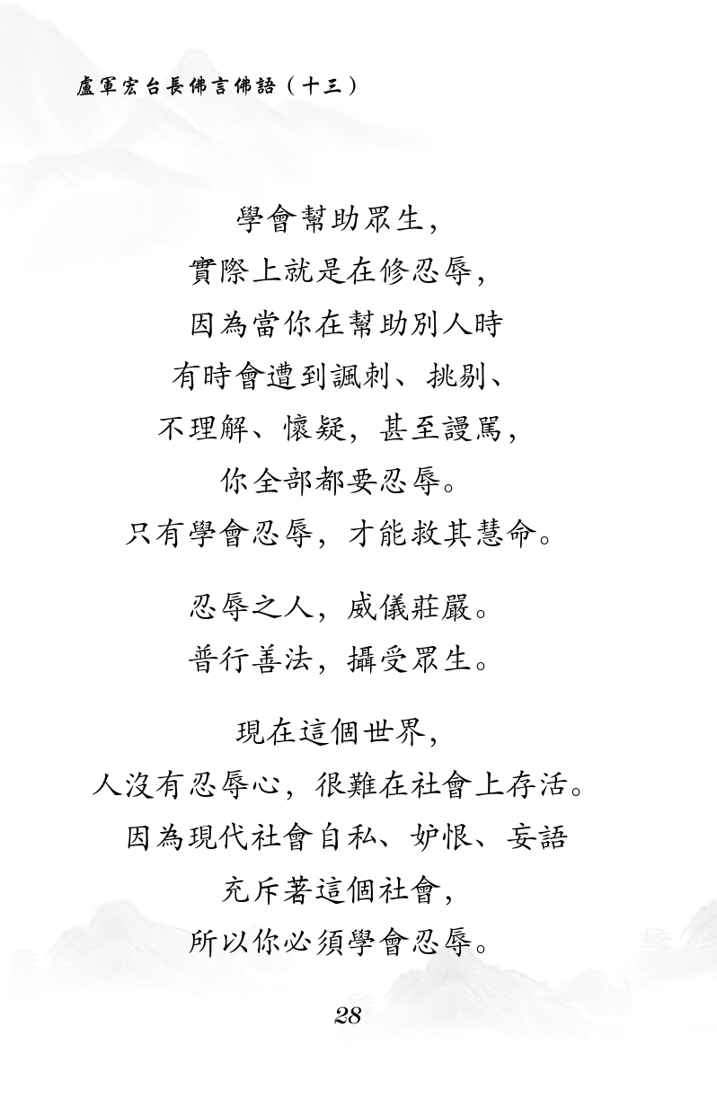 不限会员 學會幫助眾生, 實際上就是在修忍辱, 因為當你在幫助別人時 有時會遭到諷刺、挑剔、 不理解、懷疑,甚至謾駡, 你全部都要忍辱。 只有學會忍辱,才能救其慧命。 忍辱之人,威儀莊嚴。 普行善法,攝受眾生。 現在這個世界, 人沒有忍辱心,很難在社會上存活。 因為現代社會自私、妒恨、妄語 充斥著這個社會, 所以你必須學會忍辱。 |佛言佛语(十三)