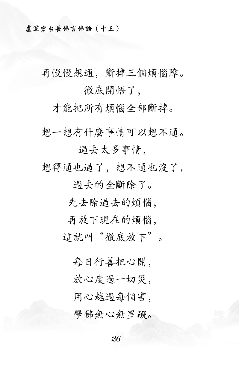 不限会员 再慢慢想通,斷掉三個煩惱障。 徹底開悟了, 才能把所有煩惱全部斷掉。 想一想有什麼事情可以想不通。 過去太多事情, 想得通也過了,想不通也沒了, 過去的全斷除了。 先去除過去的煩惱, 再放下現在的煩惱, 這就叫“徹底放下”。 每日行善把心開, 放心度過一切災, 用心越過每個害, 學佛無心無罣礙。 |佛言佛语(十三)