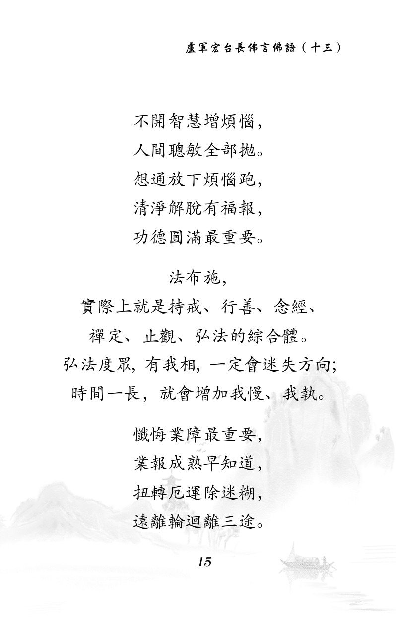 不限会员 不開智慧增煩惱, 人間聰敏全部拋。 想通放下煩惱跑, 清淨解脫有福報, 功德圓滿最重要。 法布施, 實際上就是持戒、行善、念經、 禪定、止觀、弘法的綜合體。 弘法度眾,有我相,一定會迷失方向; 時間一長,就會增加我慢、我執。 懺悔業障最重要, 業報成熟早知道, 扭轉厄運除迷糊, 遠離輪迴離三途。 |佛言佛语(十三)
