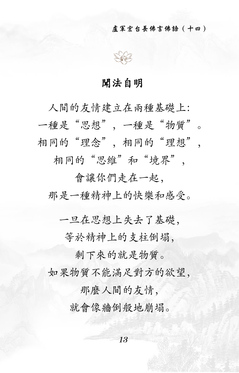 不限会员 聞法自明 人間的友情建立在兩種基礎上: 一種是“思想”,一種是“物質”。 相同的“理念”,相同的“理想”, 相同的“思維”和“境界”, 會讓你們走在一起, 那是一種精神上的快樂和感受。 一旦在思想上失去了基礎, 等於精神上的支柱倒塌, 剩下來的就是物質。 如果物質不能滿足對方的欲望, 那麼人間的友情, 就會像牆倒般地崩塌。 |佛言佛语(十四)
