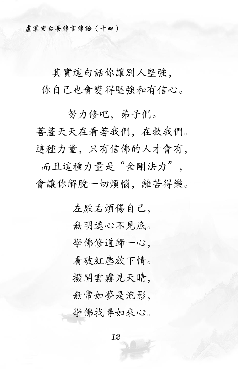 不限会员 其實這句話你讓別人堅強, 你自己也會變得堅強和有信心。 努力修吧,弟子們。 菩薩天天在看著我們,在救我們。 這種力量,只有信佛的人才會有, 而且這種力量是“金剛法力”, 會讓你解脫一切煩惱,離苦得樂。 左厭右煩傷自己, 無明遮心不見底。 學佛修道歸一心, 看破紅塵放下情。 撥開雲霧見天晴, 無常如夢是泡影, 學佛找尋如來心。 |佛言佛语(十四)