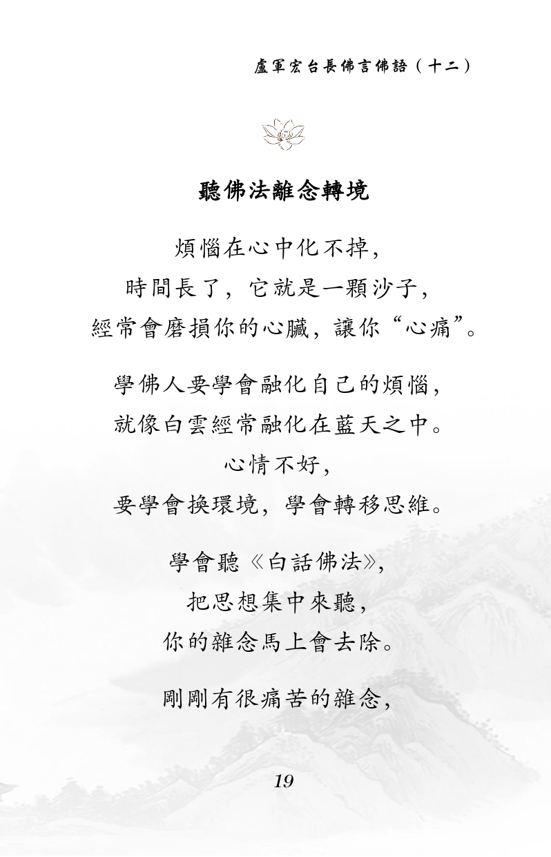不限会员 听佛法离念转境 烦恼在心中化不掉, 时间长了,它就是一颗沙子, 经常会磨损你的心脏,让你“心痛”。 学佛人要学会融化自己的烦恼, 就像白云经常融化在蓝天之中。 心情不好, 要学会换环境,学会转移思维。 学会听《白话佛法》, 把思想集中来听, 你的杂念马上会去除。 刚刚有很痛苦的杂念, |佛言佛语(十二)