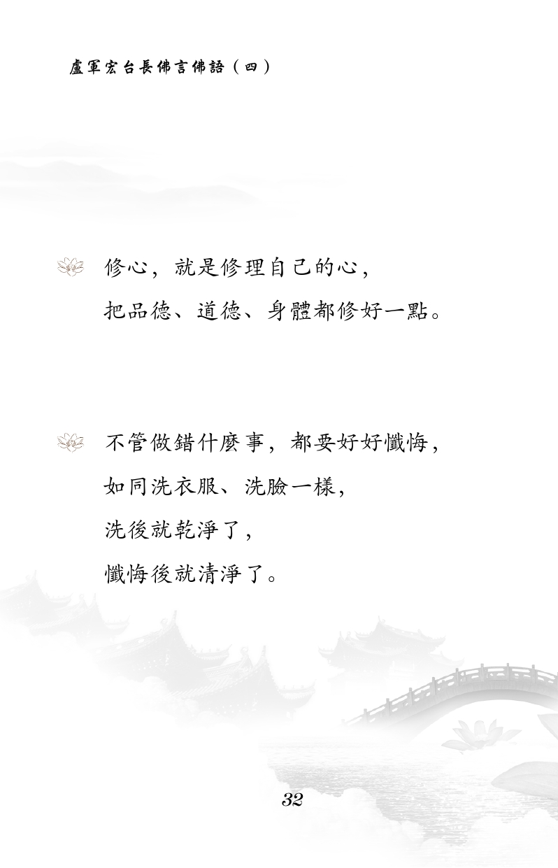 不限会员 修心,就是修理自己的心, 把品德、道德、身体都修好一点。 不管做错什么事,都要好好忏悔, 如同洗衣服、洗脸一样, 洗后就干净了, 忏悔后就清净了。 |佛言佛语 第四册