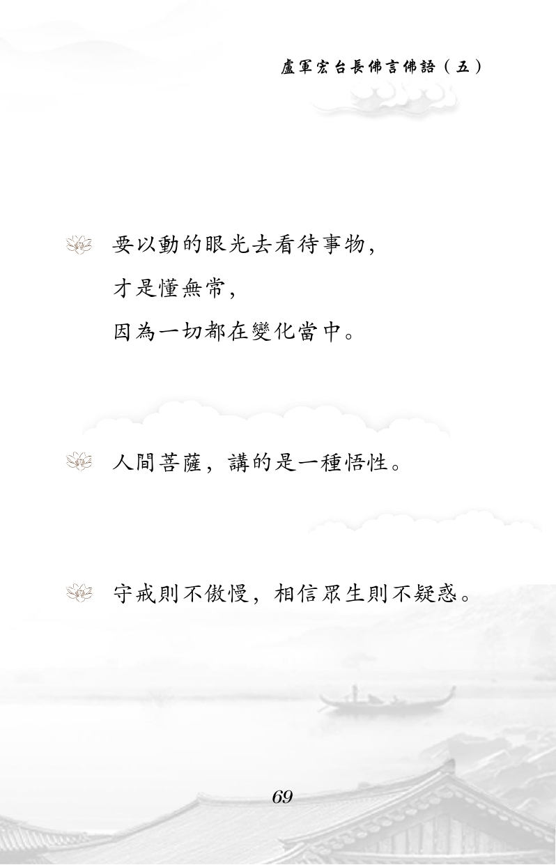 不限会员 要以动的眼光去看待事物, 才是懂无常, 因为一切都在变化当中。 人间菩萨,讲的是一种悟性。 守戒则不傲慢,相信众生则不疑惑。 |佛言佛语 第五册