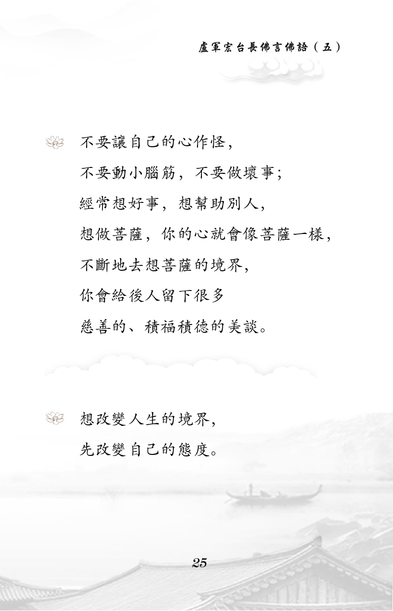 不限会员 不要让自己的心作怪, 不要动小脑筋,不要做坏事; 经常想好事,想帮助别人, 想做菩萨,你的心就会像菩萨一样, 不断地去想菩萨的境界, 你会给后人留下很多 慈善的、积福积德的美谈。 想改变人生的境界, 先改变自己的态度。 |佛言佛语 第五册