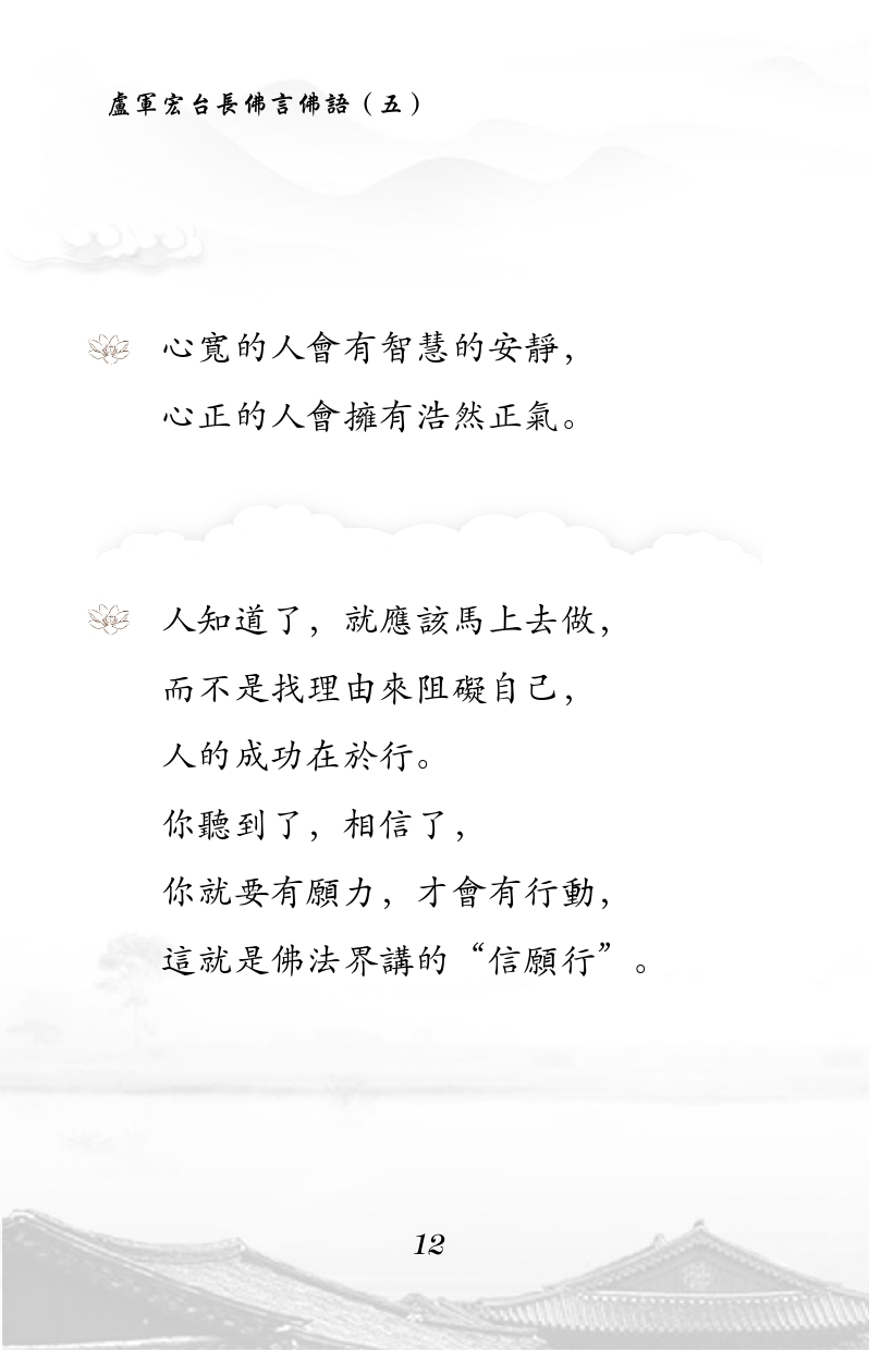 不限会员 心宽的人会有智慧的安静, 心正的人会拥有浩然正气。 人知道了,就应该马上去做, 而不是找理由来阻碍自己, 人的成功在于行。 你听到了,相信了, 你就要有愿力,才会有行动, 这就是佛法界讲的“信愿行”。 |佛言佛语 第五册