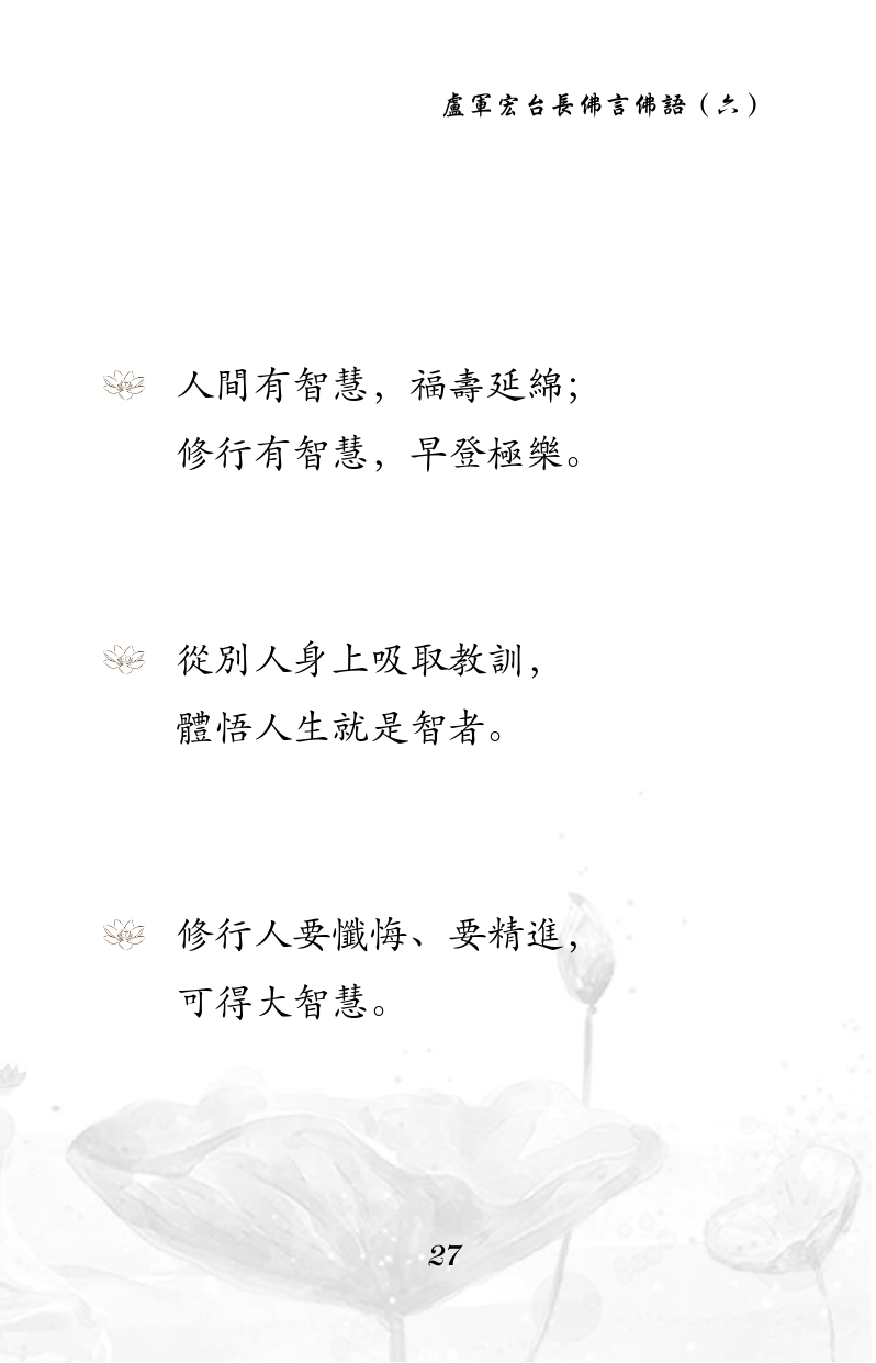 不限会员 人间有智慧,福寿延绵; 修行有智慧,早登极乐。 从别人身上吸取教训, 体悟人生就是智者。 修行人要忏悔、要精进, 可得大智慧。 |佛言佛语 第六册